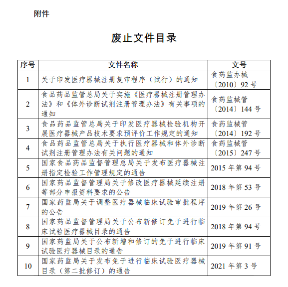 (一)《办法》实施后,附件中所列的医疗器械注册管理相关文件同时废止。